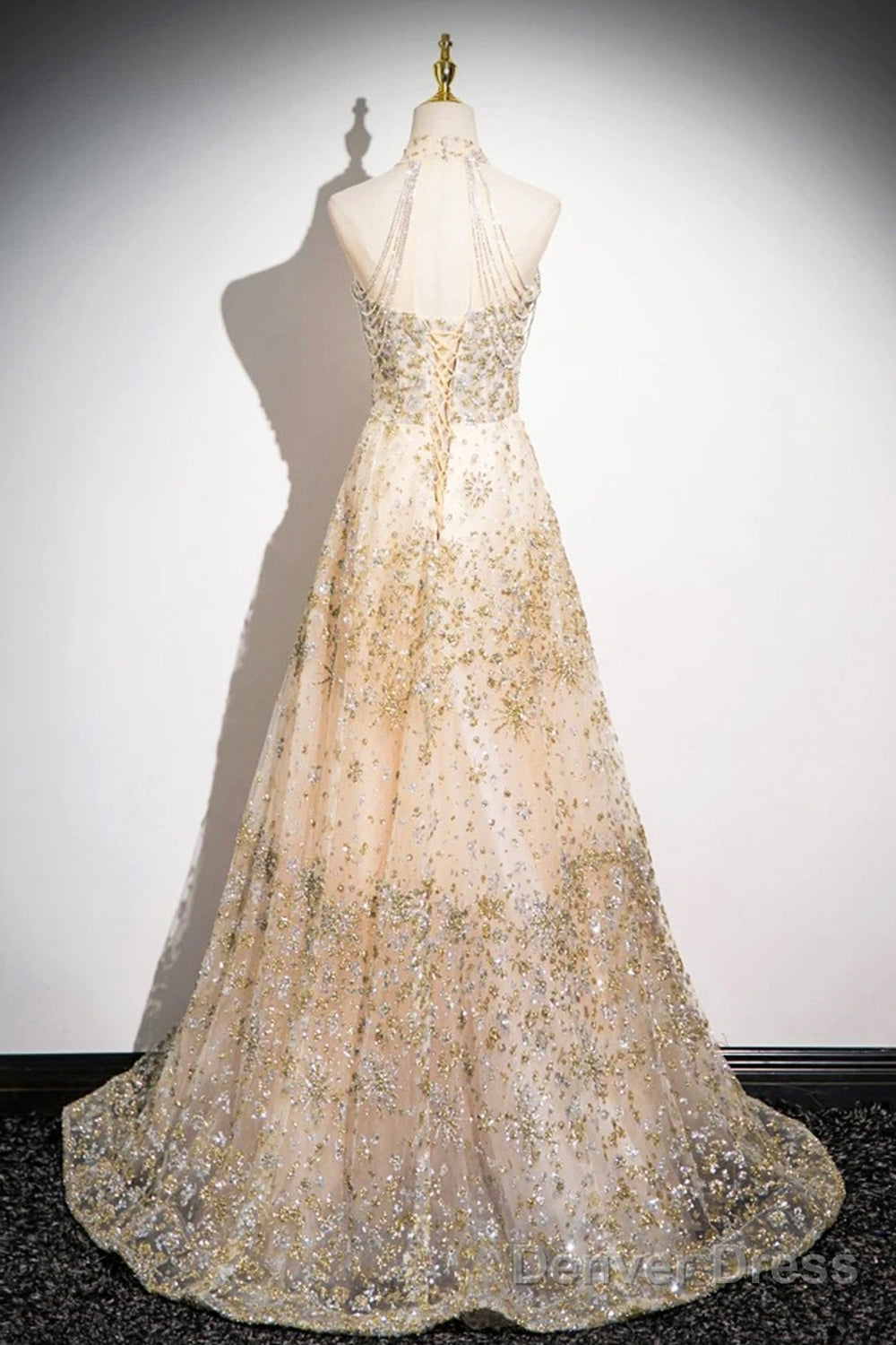 Champagne Tulle Sequins Floor Length Prom Dress, Shiny A-Line Evening Party Dress