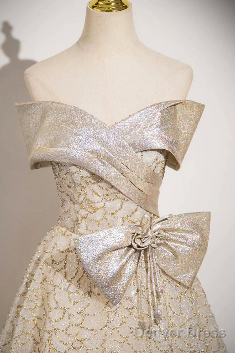Champagne Tulle Sequins Long Prom Dress, Off The Shoulder Evening Party Dress