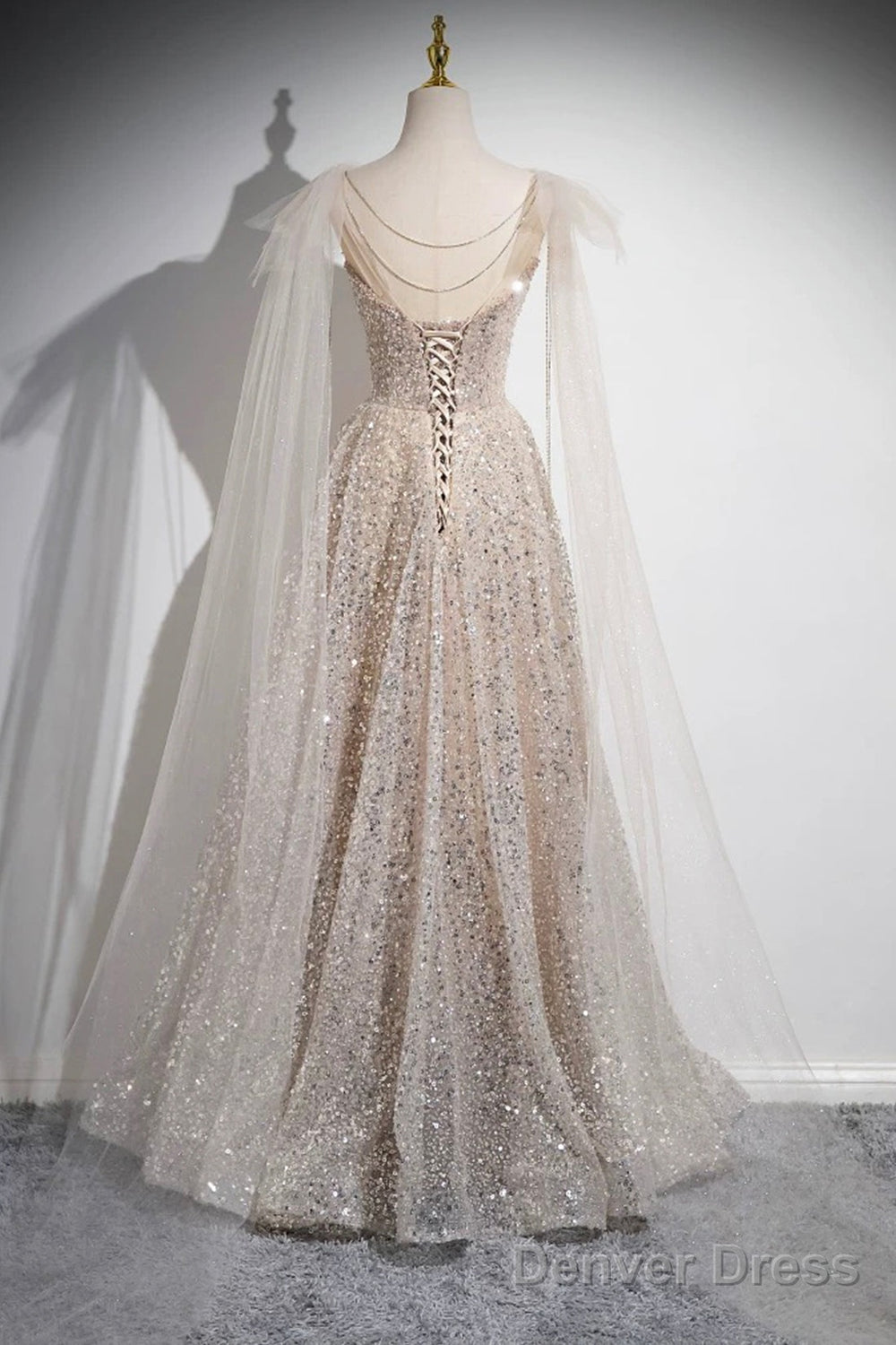 Champagne Tulle Sequins Long Prom Dress, Shiny A-Line Party Dress
