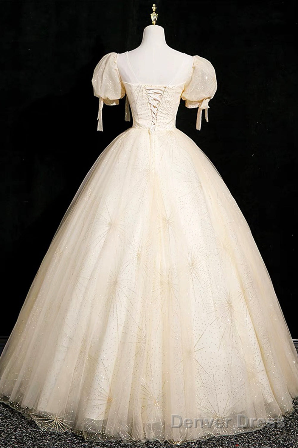 Champagne Tulle Short Sleeve Floor Length Prom Dress, Beautiful A-Line Evening Party Dress