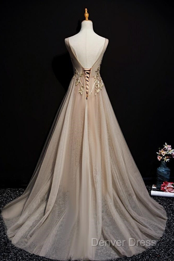 Champagne Tulle V-Neckline Long Lace Prom Dresses, A-Line Formal Gown Party Dresses