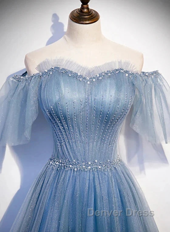 Charming Light Blue Tulle Puffy Sleeves Floor Length Party Dresses A-Line Pricess Gowns Prom Dresses Sparkly
