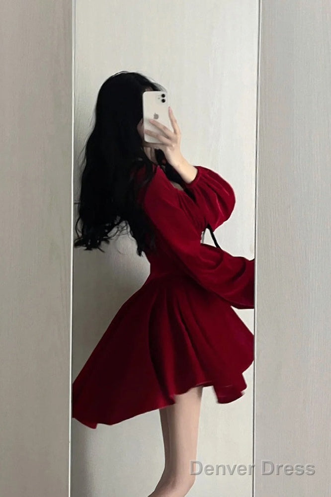 Chic A Line Square Neckline Long Sleeves Red Velvet Party Dress Birthday Dresses Birthday Outfits