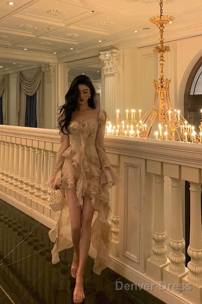 Chic High Low Sweetheart Long Sleeves Floral Ruffles Chiffon Prom Dresses Birthday Outfits