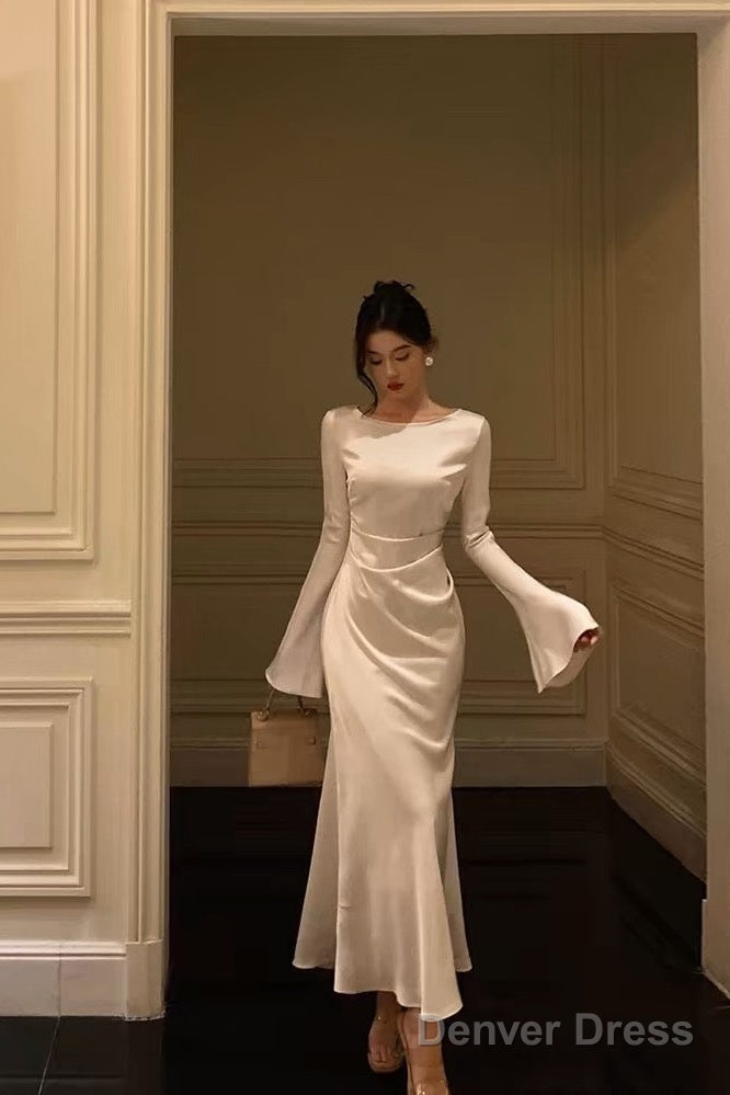 Chic Mermaid Boat Neckline Long Sleeves Silk Satin Prom Dresses Birthday Dress