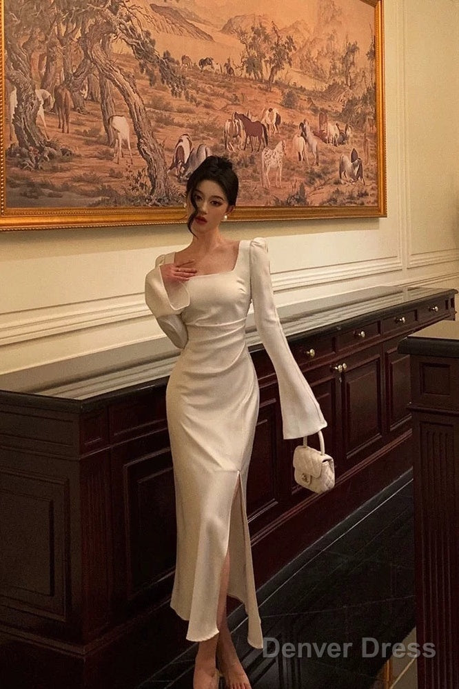 Chic Mermaid Square Neckline Long Sleeves Slit Prom Dresses Birthday Outfits