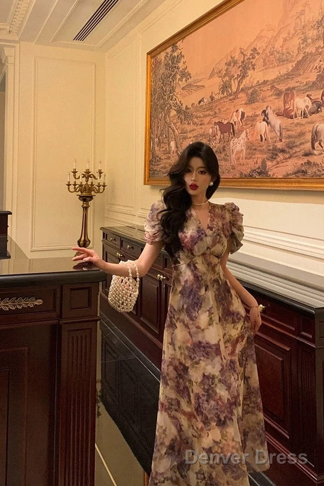 Classy A Line V Neckline Grape Flora Chiffon Prom Dresses Birthday Outfits Evening Gown