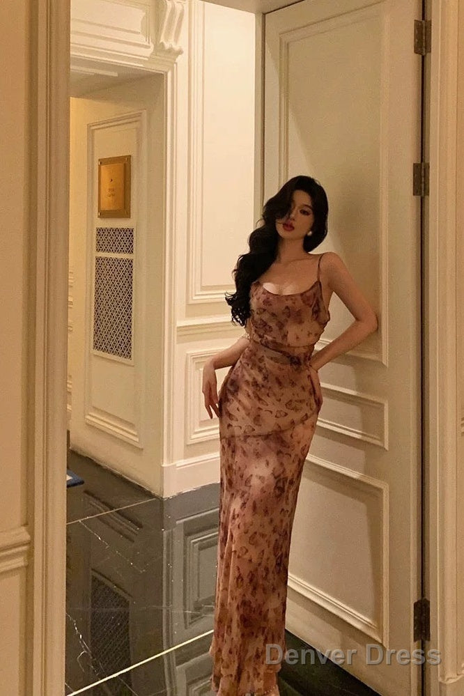 Classy Mermaid Spaghetti Straps Floral Chiffon Prom Dresses Birthday Outfits Evening Gown