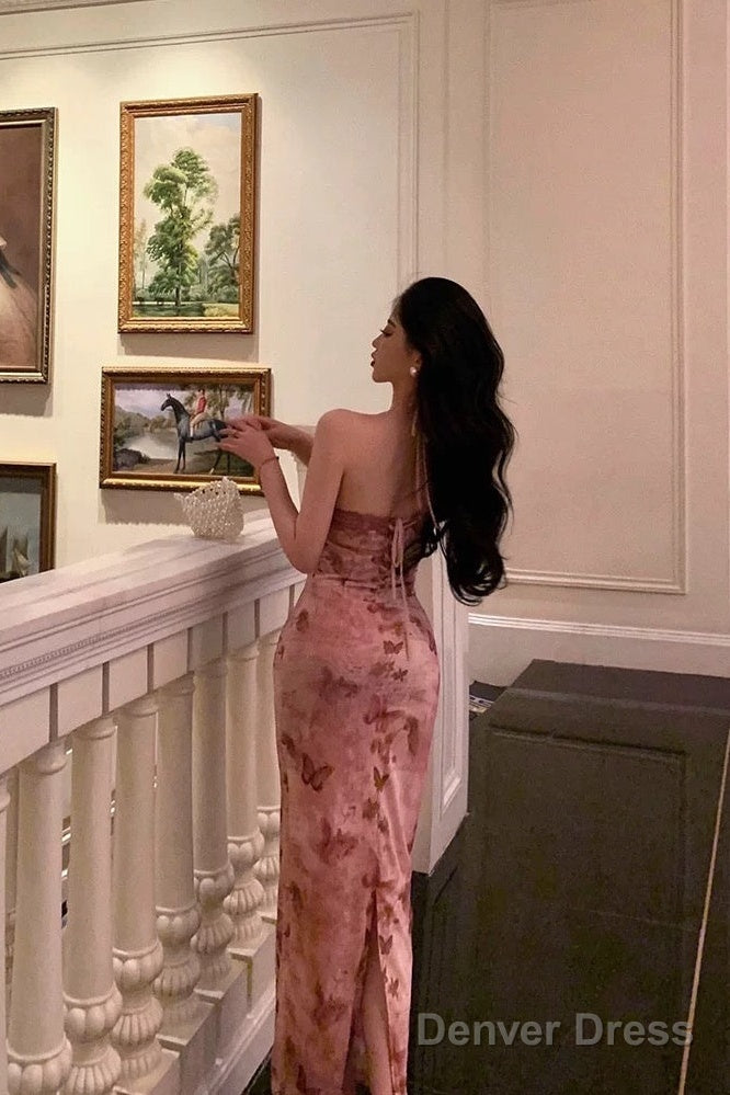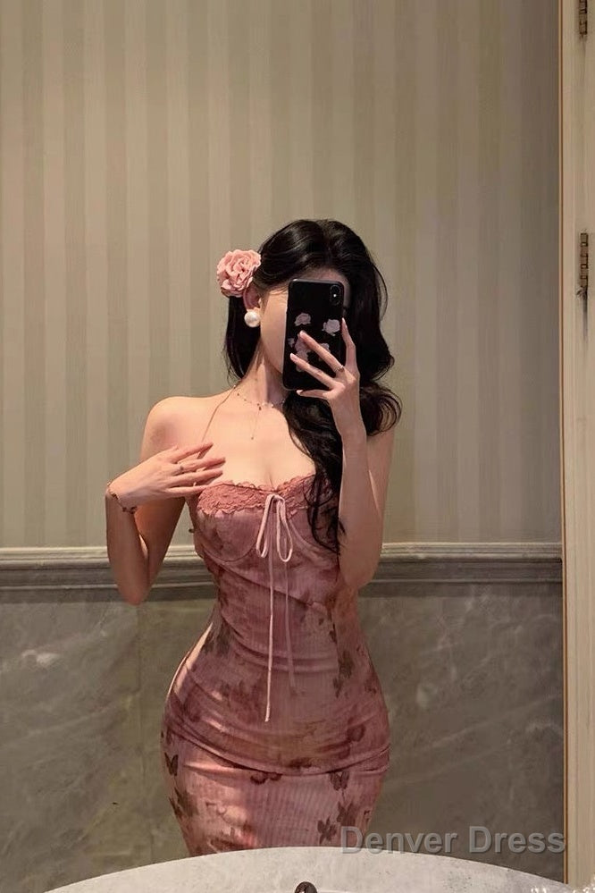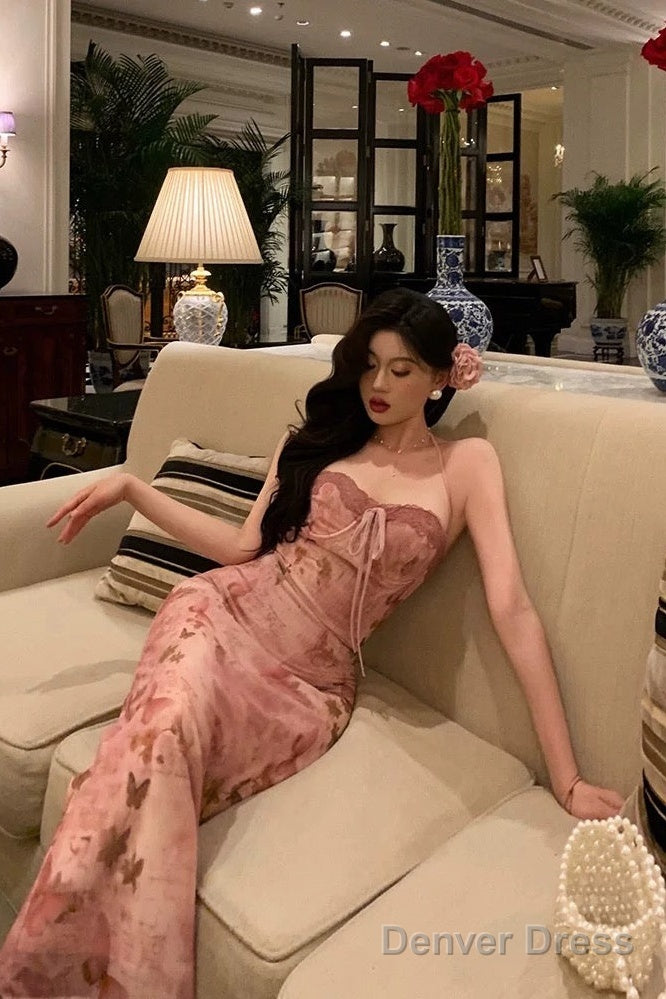Classy Mermaid Spaghetti Straps Sleeveless Pink Floral Prom Dresses Birthday Outfits