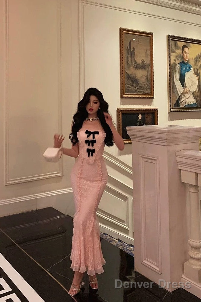 Classy Mermaid Strapless Lace Pink Prom Dresses Birthday Outfits Evening Gown
