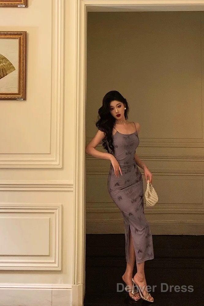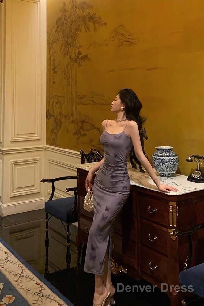 Classy Sheath Spaghetti Straps Grape Long Prom Dresses Birthday Outfits Evening Gown