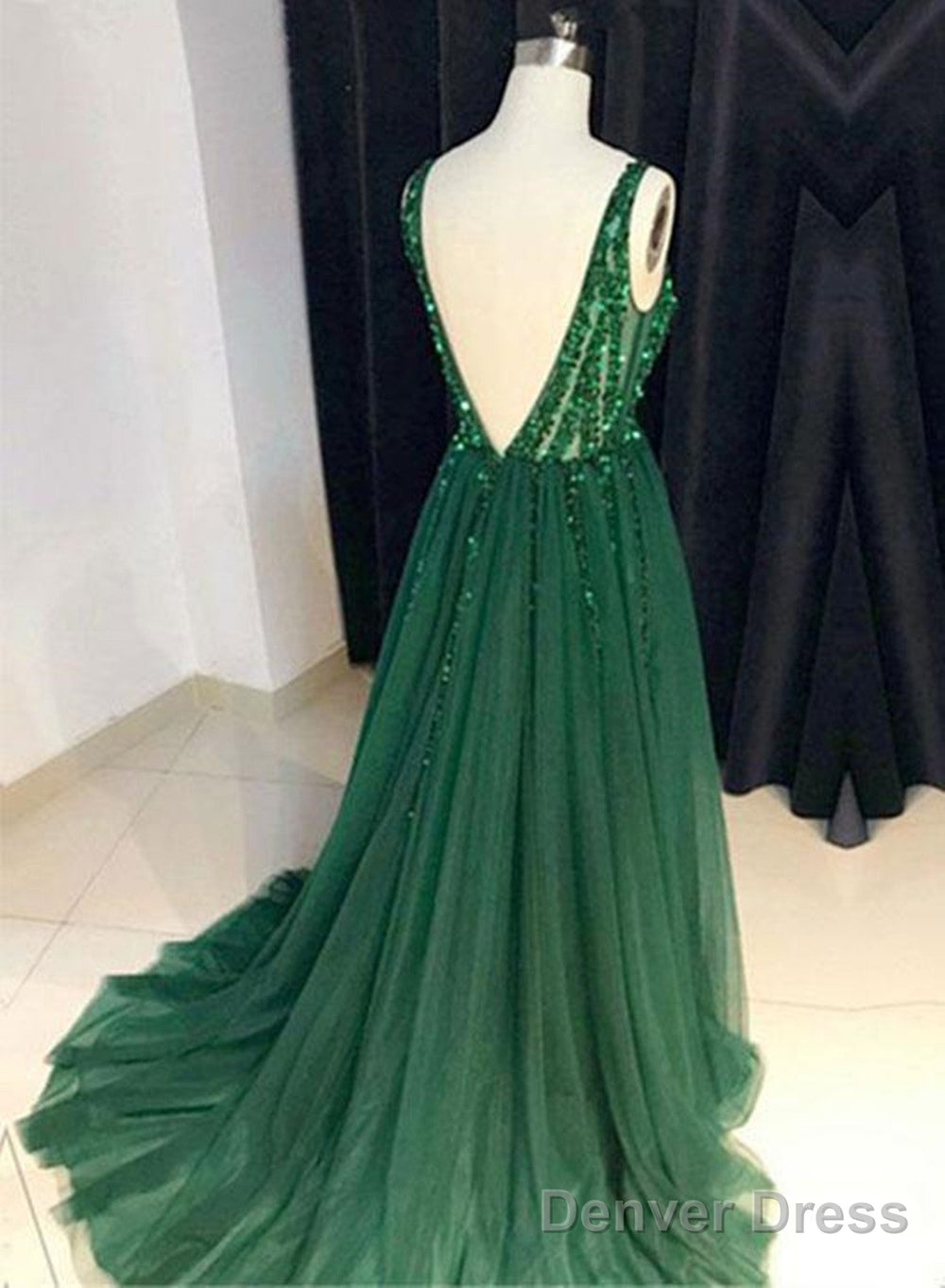Custom Made A Line V Neck Emerald Green Backless Prom Dresses, Backless Green Graduation Formal Dresses