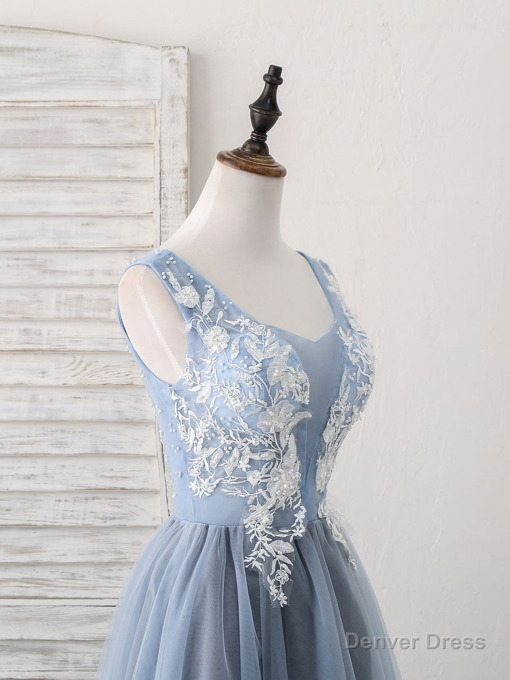 Cute Blue V Neck Tulle Lace Applique Short Prom Dress, Blue Homecoming Dress