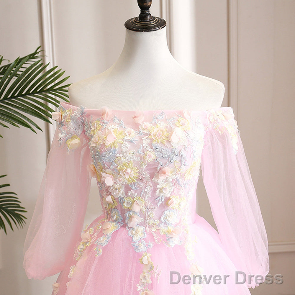 Cute Pink Ball Gown Sweet 16 Dress With Flowers, Pink Tulle Long Formal Dress