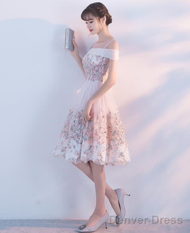 Cute Pink Round Neckline Flower Lace Short Party Dress, Pink Formal Dress Short