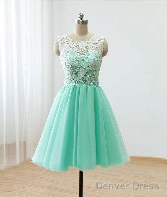 Cute Round Neck Lace Tulle Short Green Prom Dress, Bridesmaid Dress