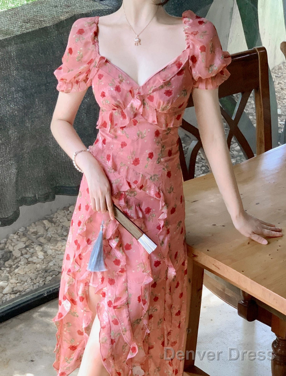Cute Sheath V Neckline Ruffled Pink Chiffon Floral Beach Dress WomenS Vacation Dresses