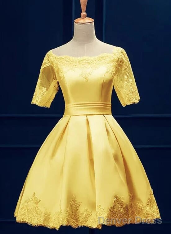 Cute Short Sleeves Satin Knee Length Party Dress, Short Homecoming Dress