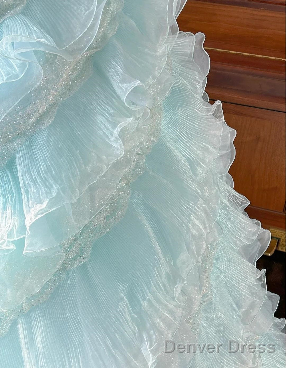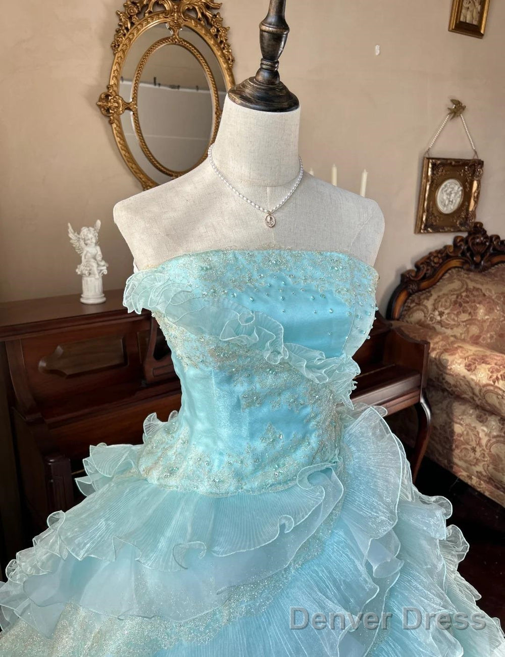 Cute Sky Blue A-Line Strapless Tulle Beaded Long Prom Dress Sequined Layered Adult Ceremony Dress