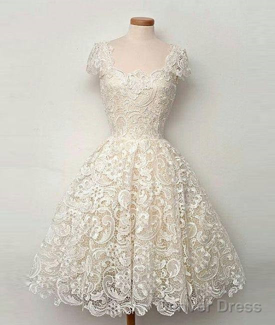 Cute White Lace Short Prom Dress, Lace Bridesmaid Dress