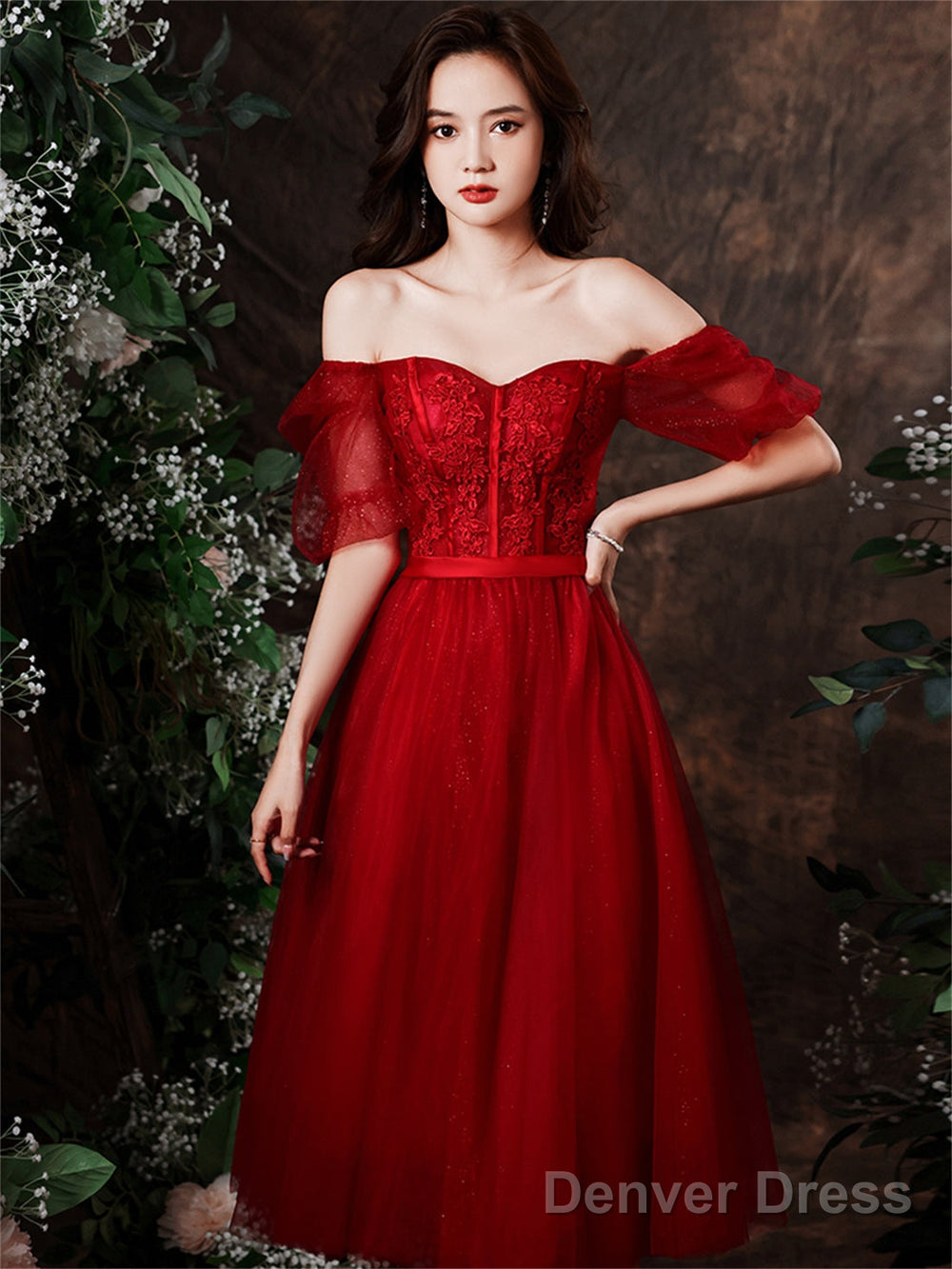 Cute Wine Red Tulle With Lace Tea Length Formal Dress, Wine Red Evening Dresses