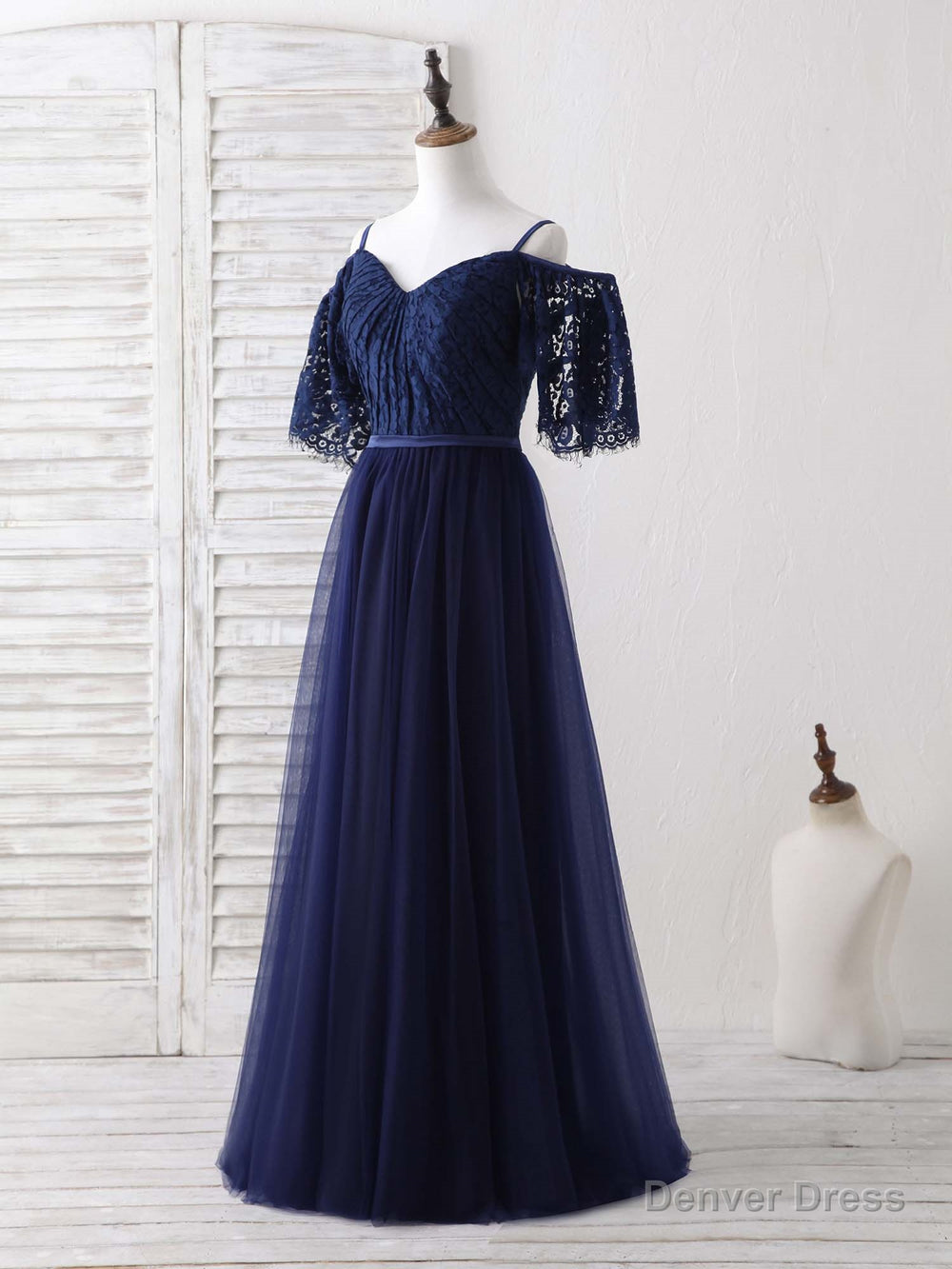 Dark Blue A-Line Lace Tulle Long Prom Dress Blue Evening Dress