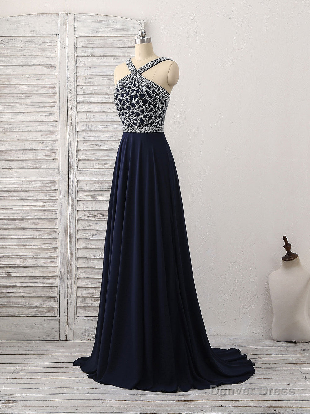 Dark Blue Chiffon Beads Long Prom Dress, Blue Evening Dress