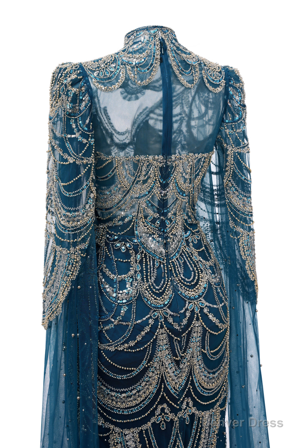 Dark Blue Mermaid Prom Dresses Beading Tulle Women Luxury Evening Dresses High Neck Long Sleeves