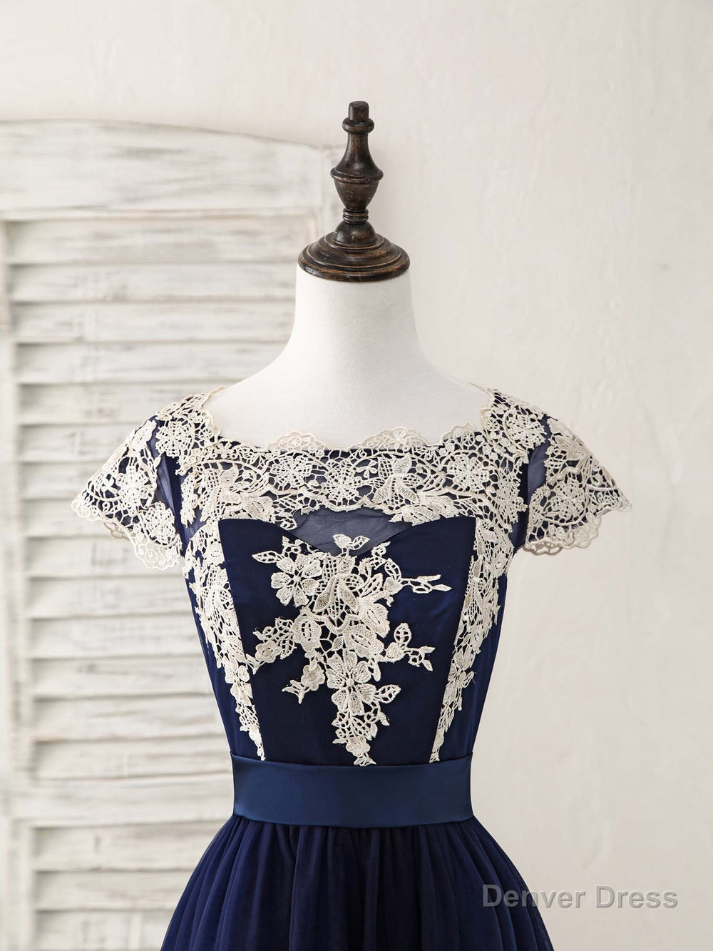 Dark Blue Tulle Lace Applique High Low Prom Dresses