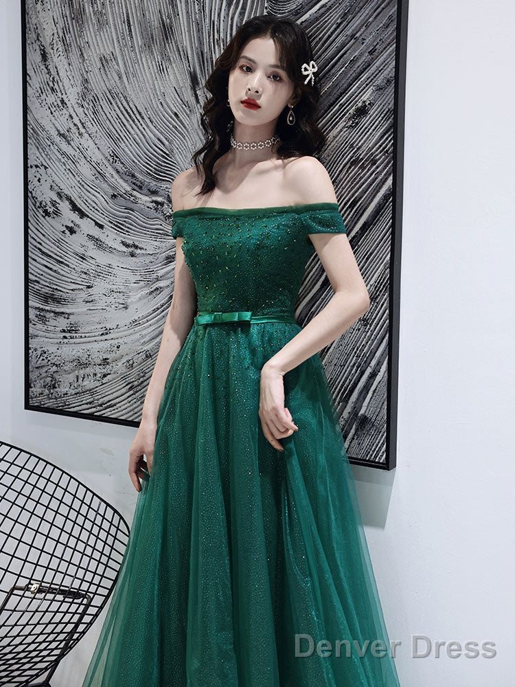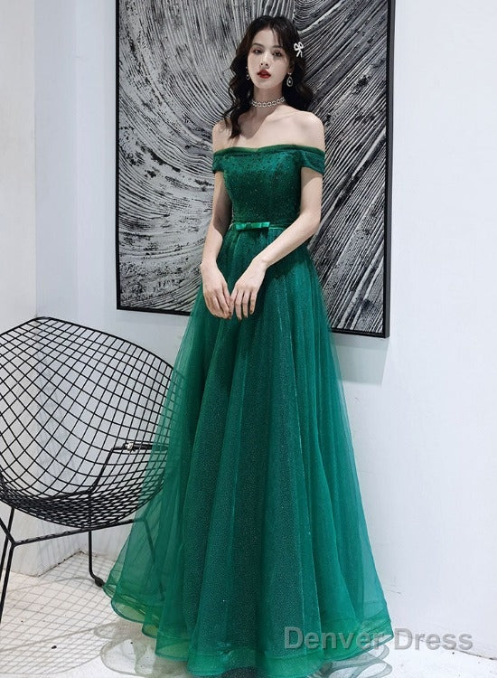 Dark Green Tulle Beaded Off Shoulder Long Party Dresses, A-Line Long Evening Dresses