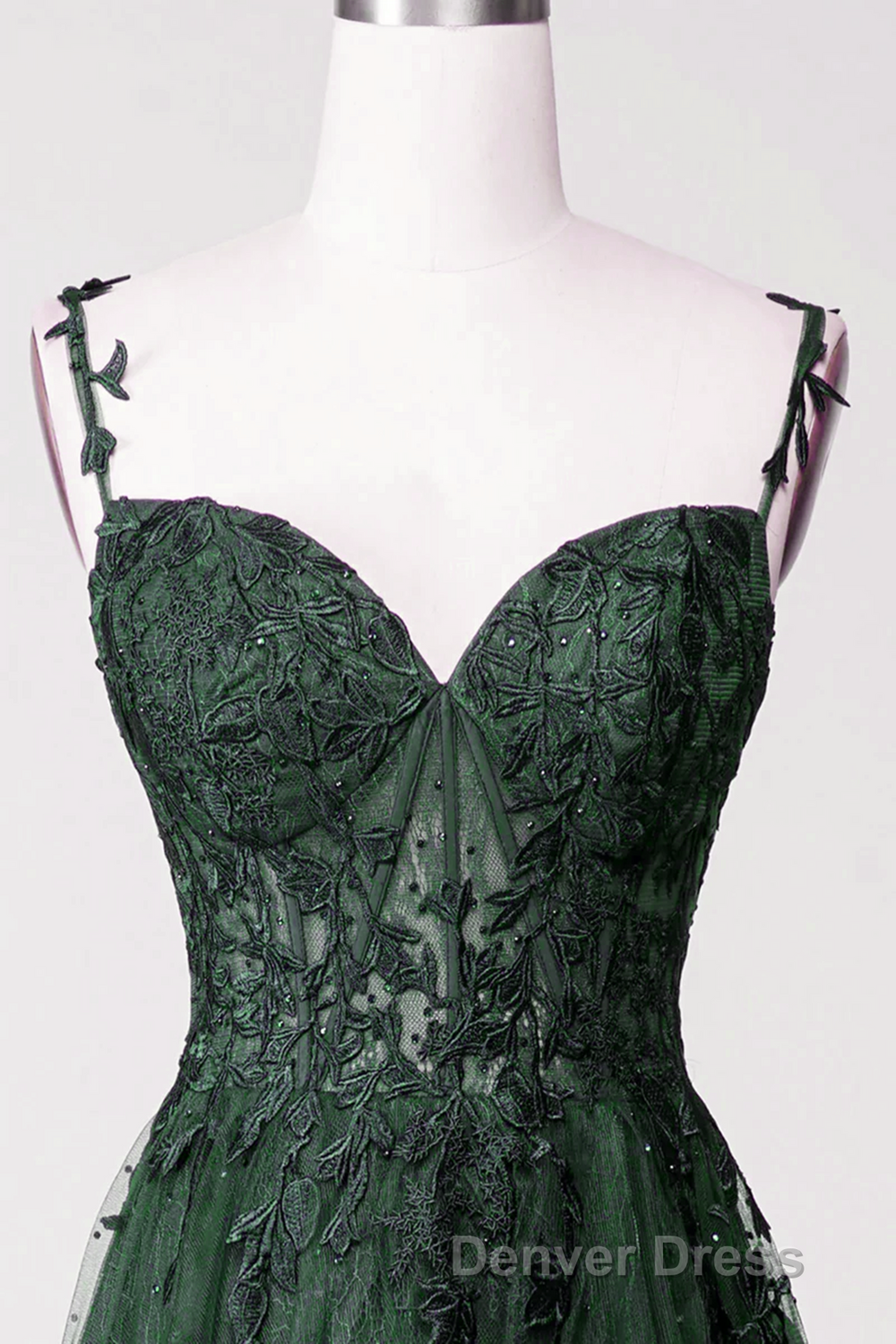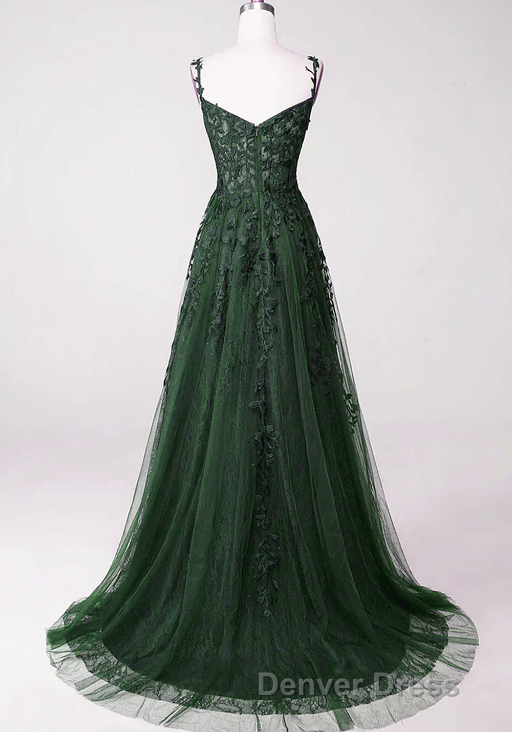 Dark Green Tulle With Lace Beaded Straps Prom Dresses, Green Long Formal Dresses Party Dresses
