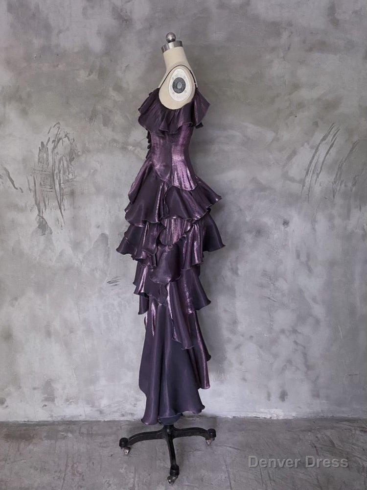 Dark Purple Asymmetrical Layered Flounce Spaghetti Strap Dress Evening Gown