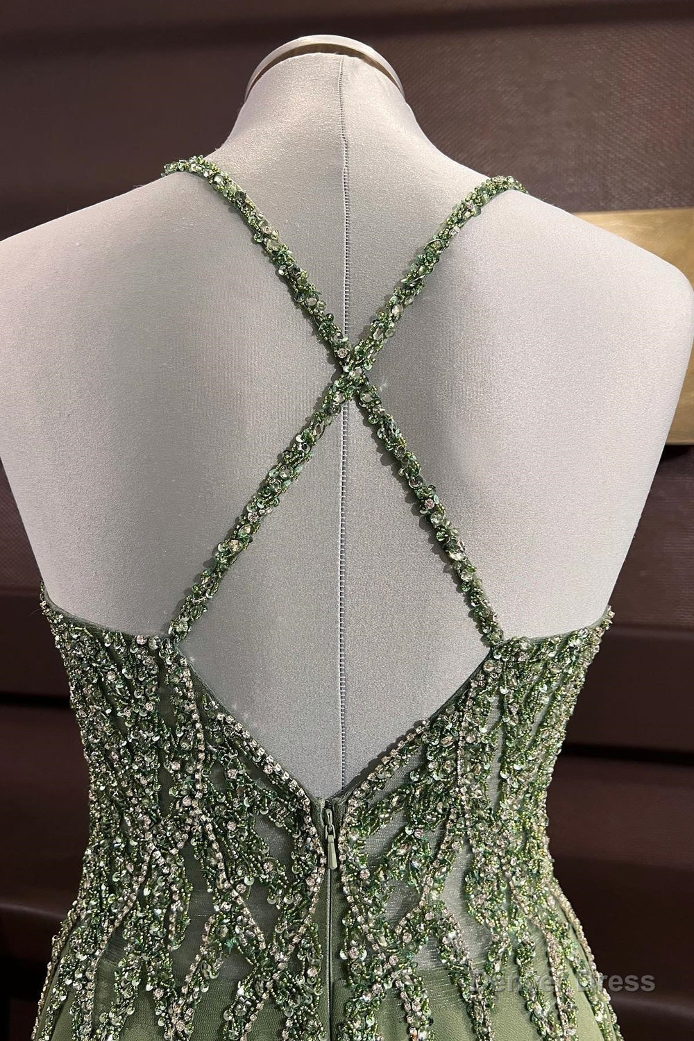 Dusty Sage Beaded Cross Back V Neck Seqins-Embroidery Long Prom Dress