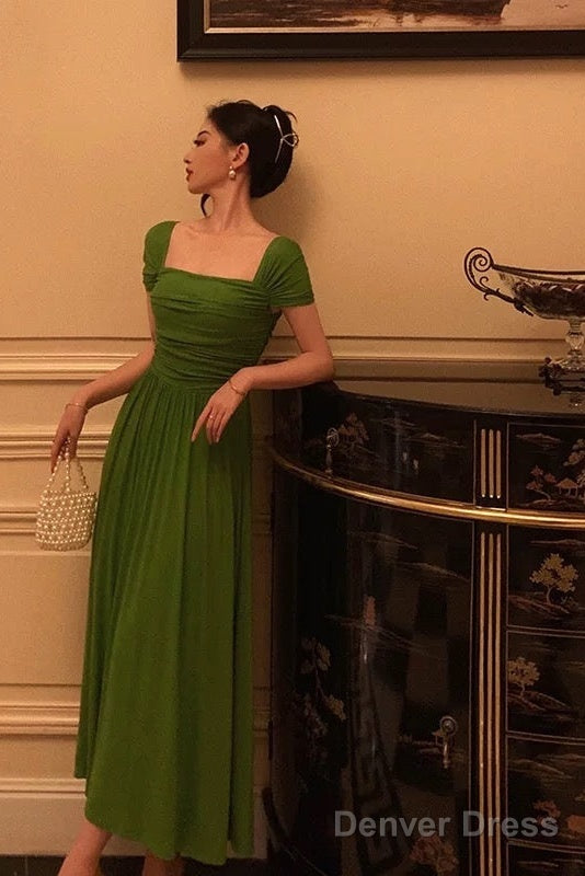 Elegant A Line Square Neckline Green Long Prom Dresses Birthday Outfits Evening Gown