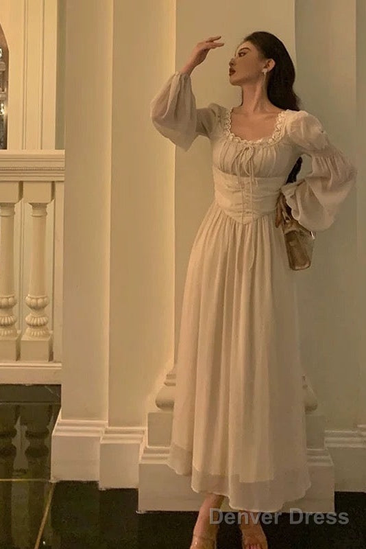 Elegant A Line Square Neckline Long Sleeves White Chiffon Prom Dresses Birthday Outfits Evening Gown