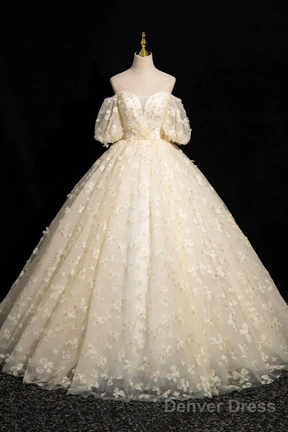 Elegant A-Line Tulle Floor Length Prom Dress, Champagne Off The Shoulder Evening Party Dress