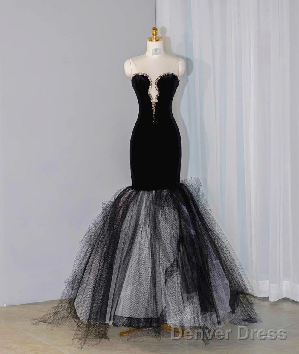Elegant Black Velvet Mermaid Strapless Beaded Long Prom Dress Tulle Formal Evening Dress
