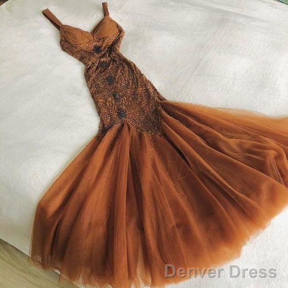 Elegant Brown Mermaid Spaghetti Strap Chiffon Tulle Beaded Long Prom Dress Birthday Dress