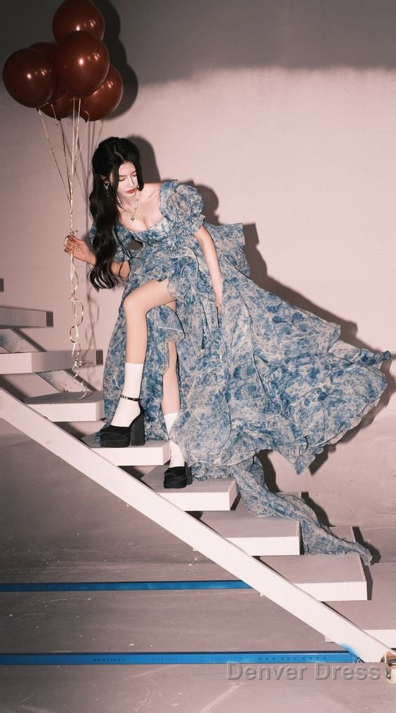 Elegant High Low Blue Floral Prom Dresses Long Formal Dress