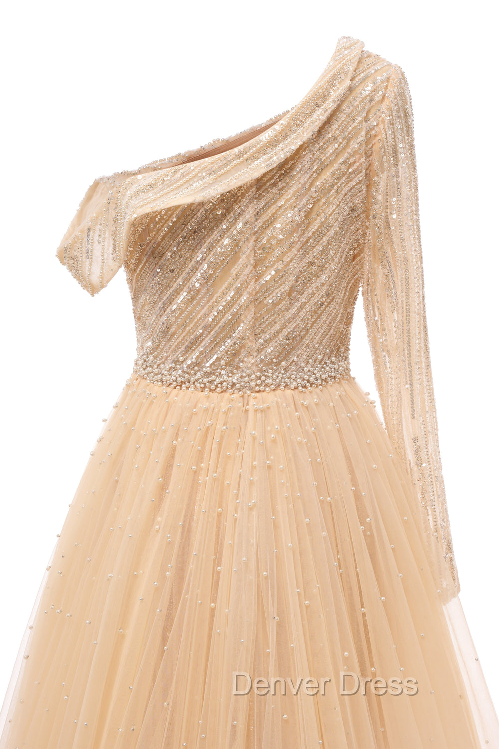 Elegant One Shoulder Beige Prom Dresses Sheer Beading Lace Formal Dresses