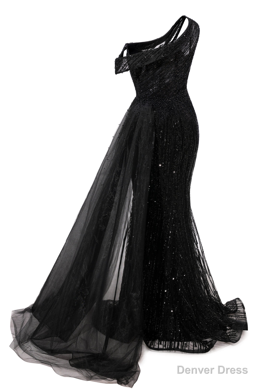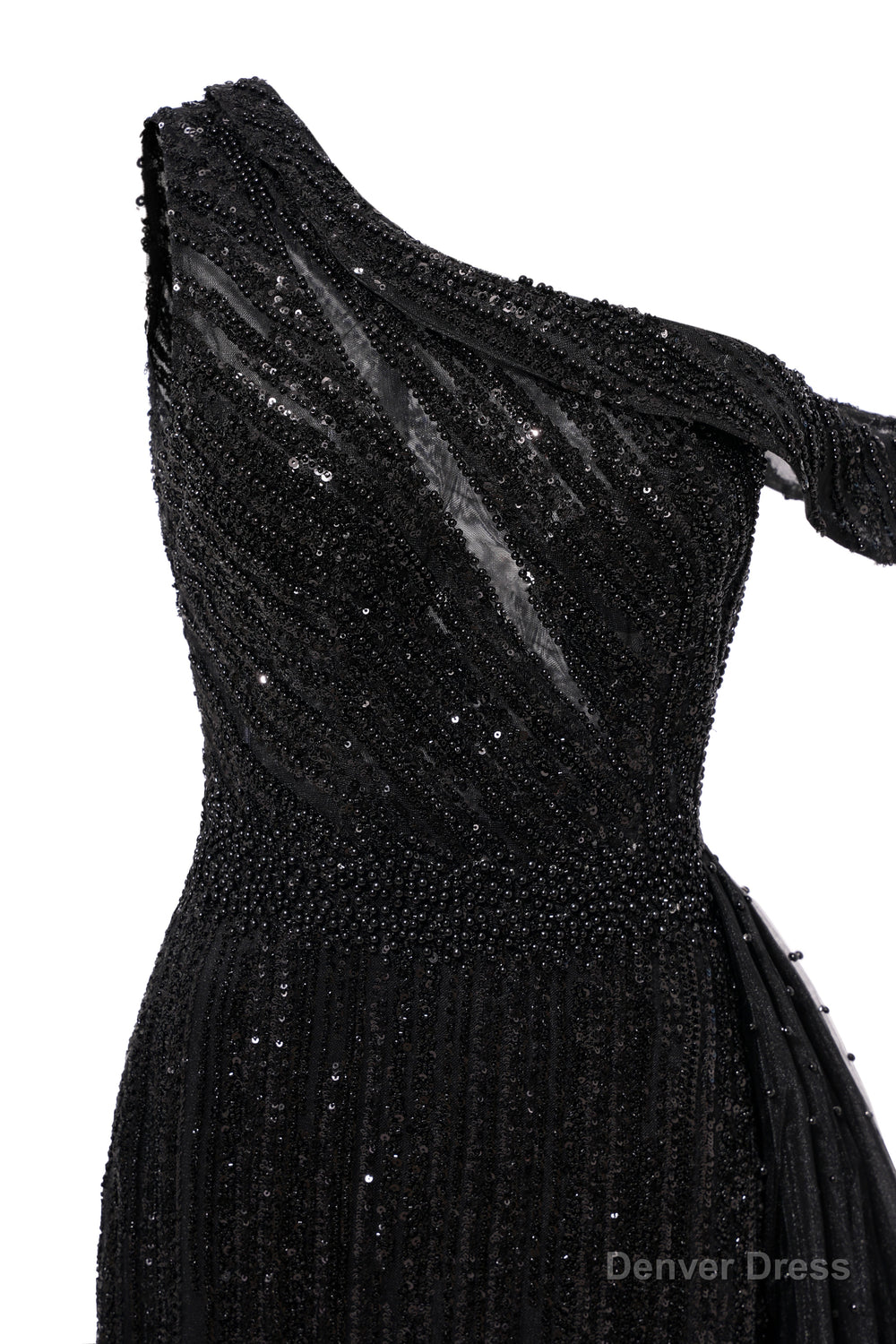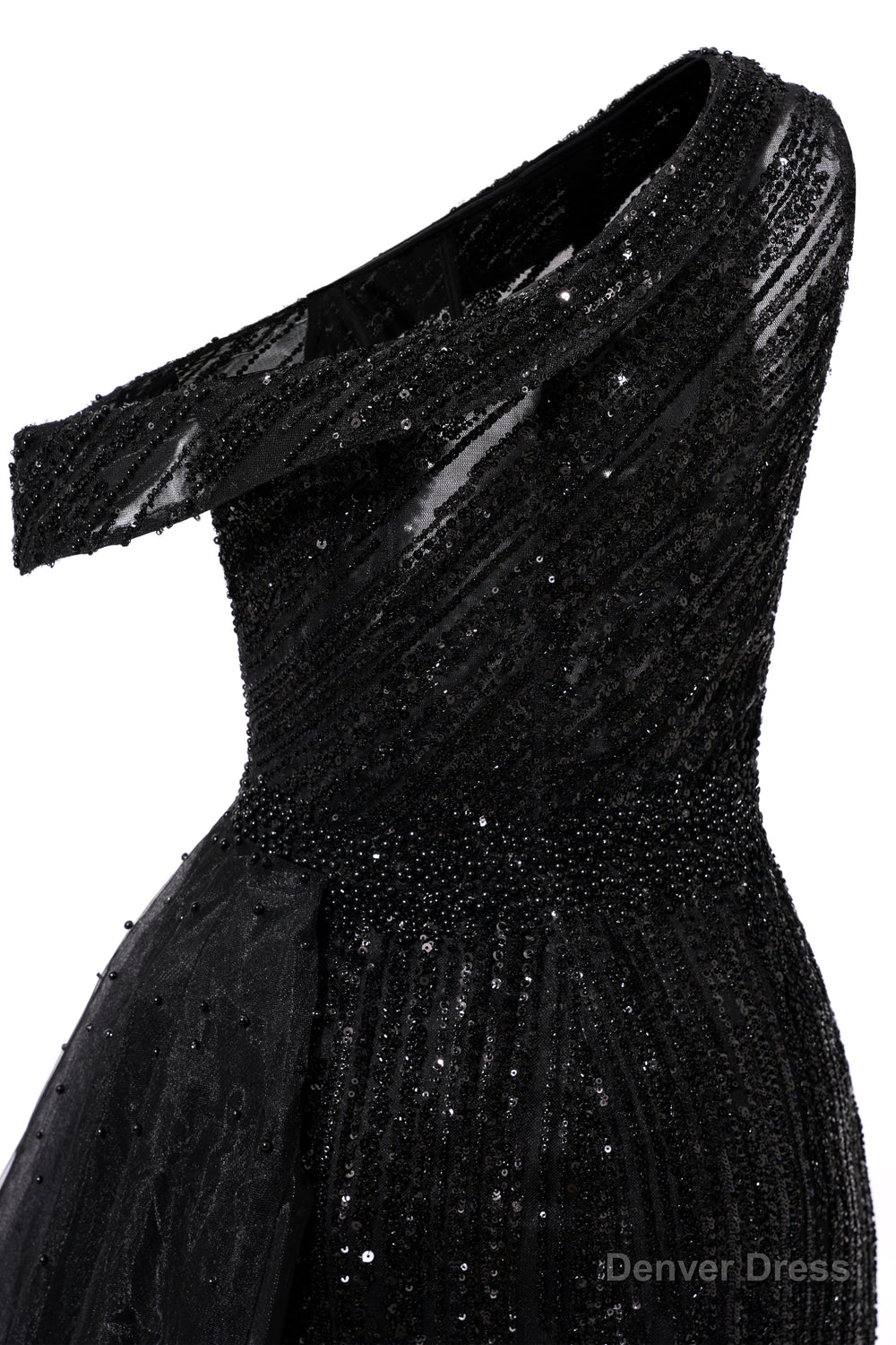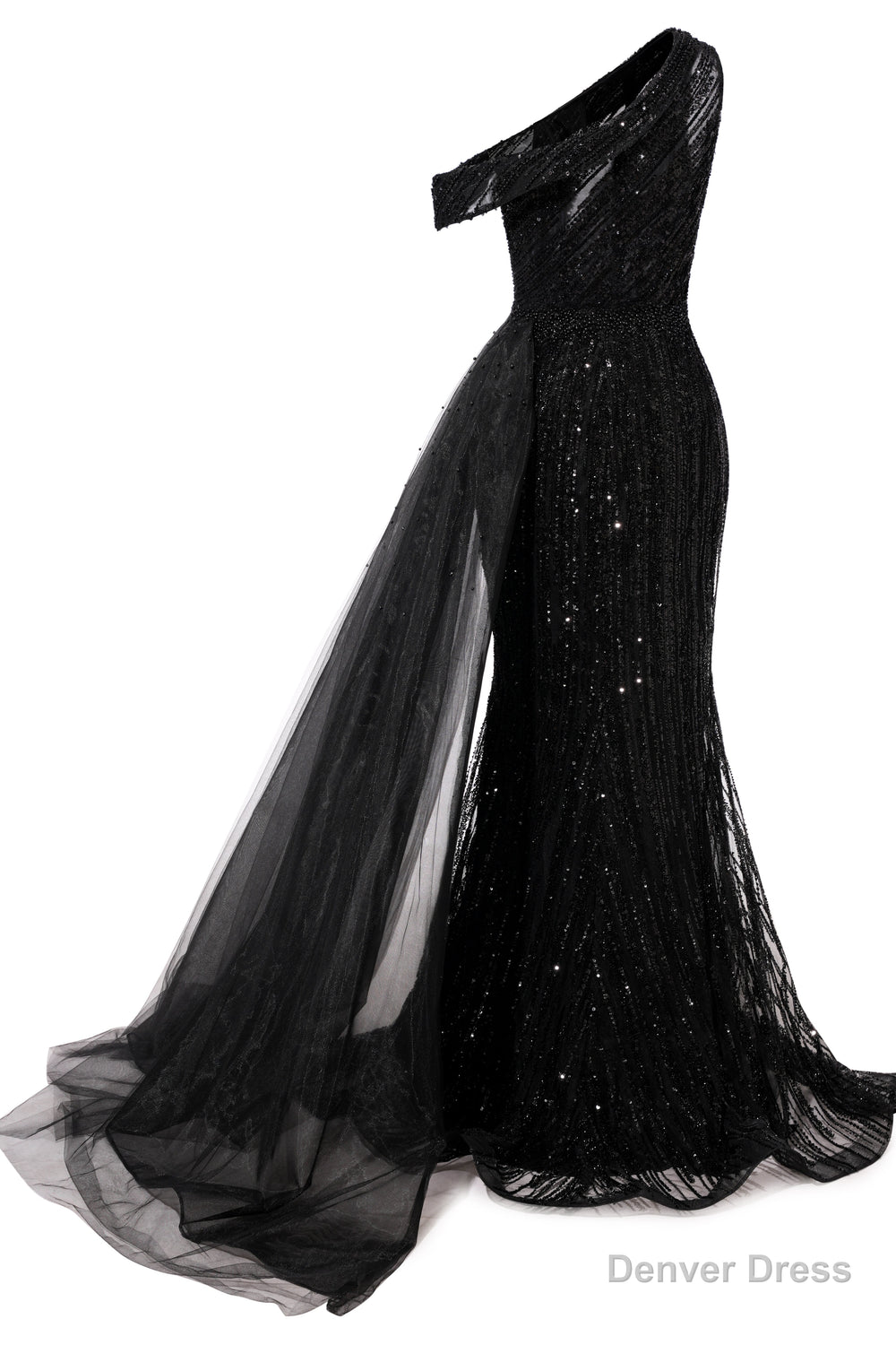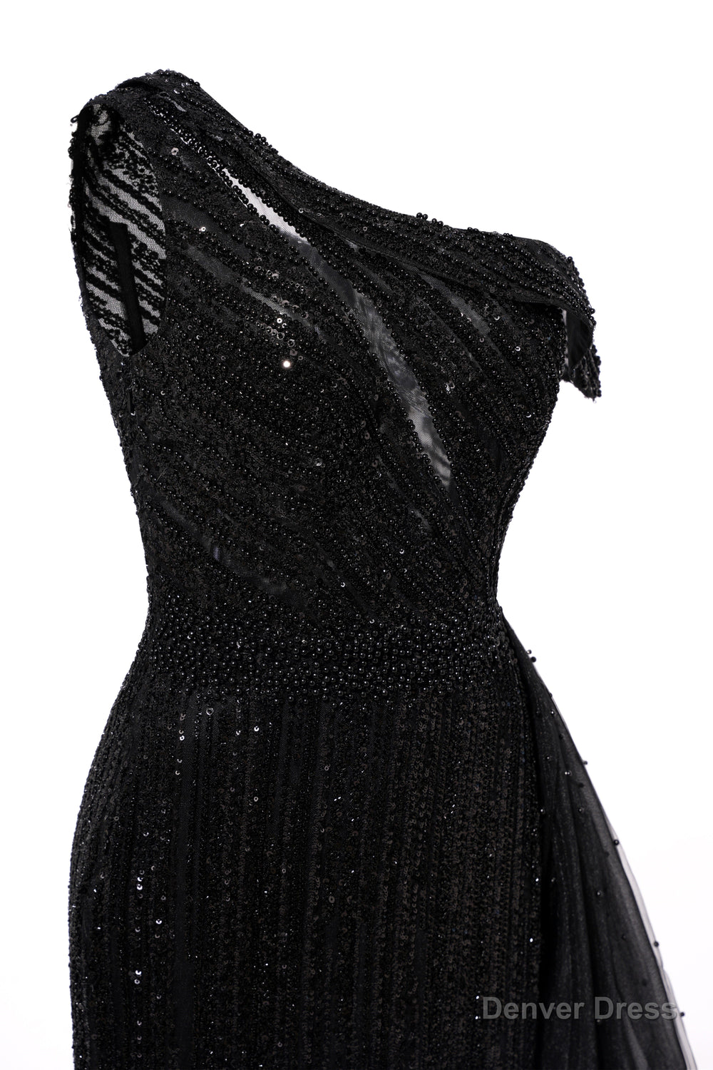 Elegant One Shoulder Black Prom Dresses Sheer Beading Lace Formal Dresses