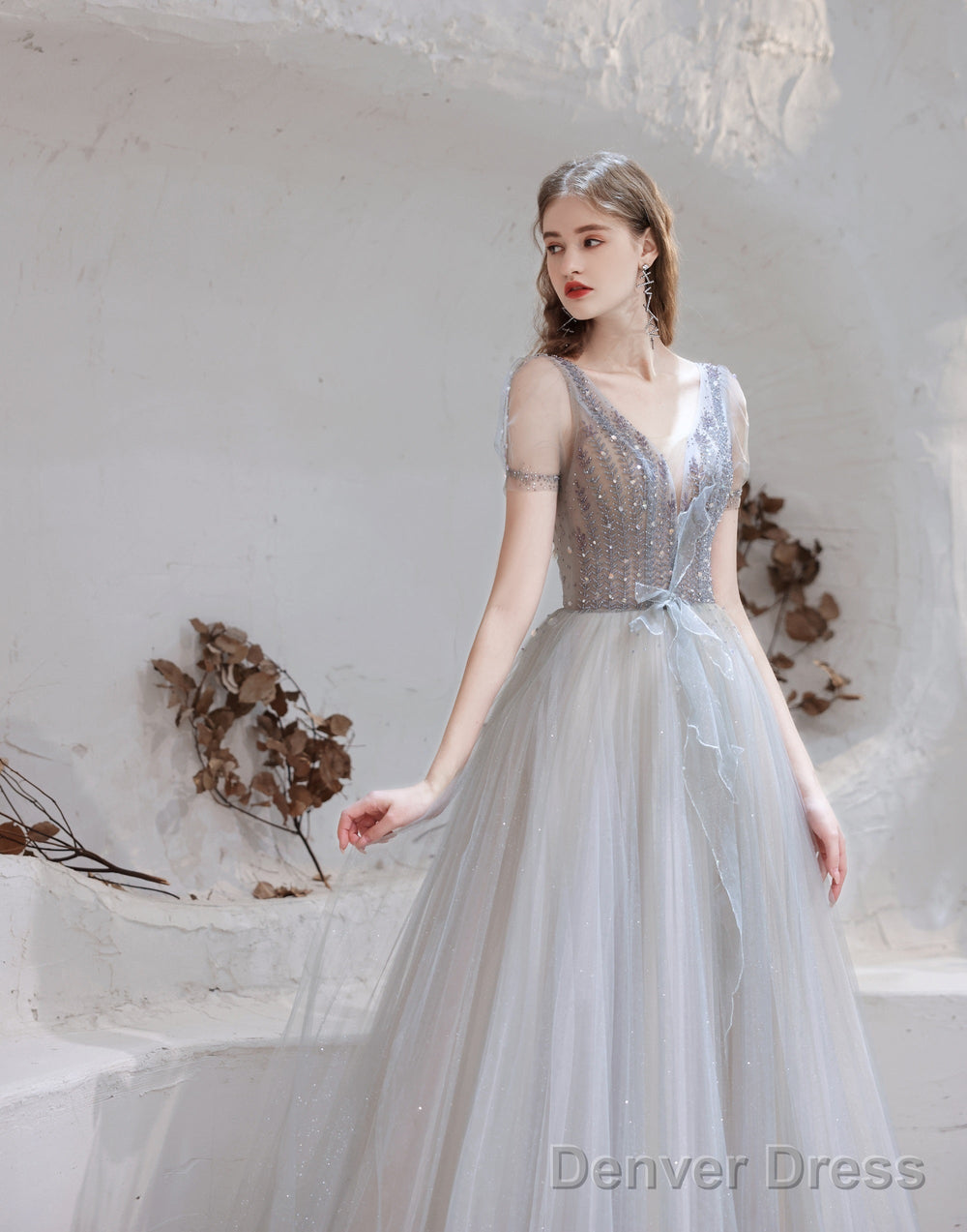 Elegant Prom Dress, Formal V Neck Short Sleeves Beaded Tulle Dresses, A Ling Floor Length
