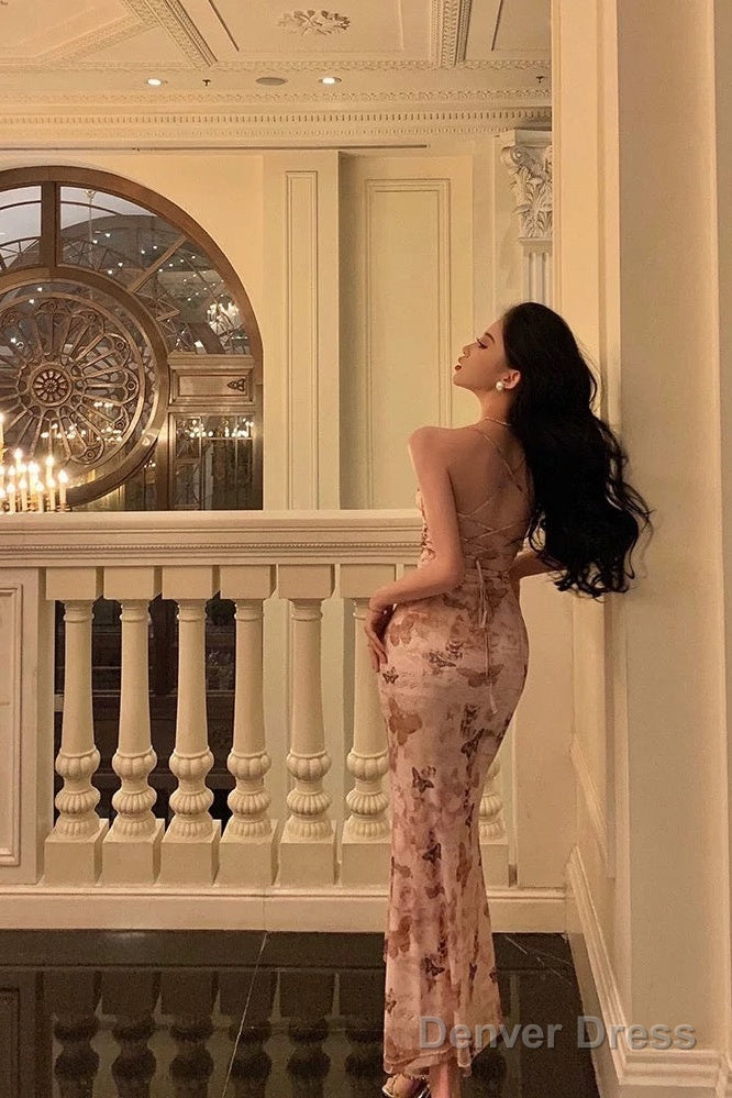 Elegant Sheath Spaghetti Straps Floral Pink Prom Dresses Birthday Outfits Evening Gown