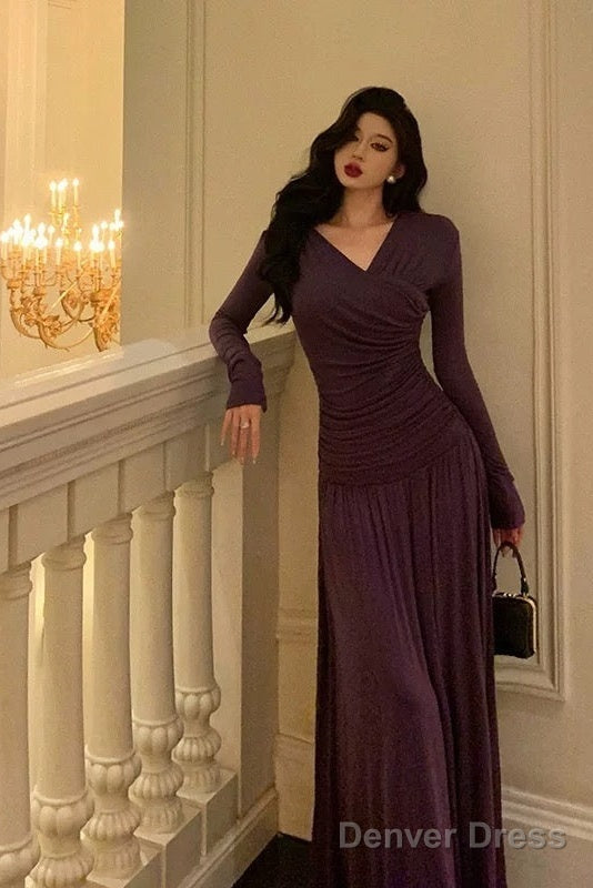 Elegant Sheath V Neckline Grape Long Prom Dresses Birthday Outfits Evening Gown