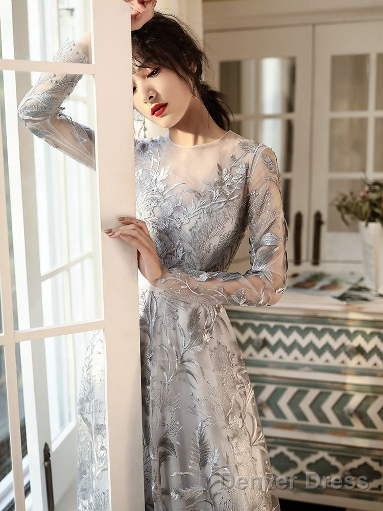 Elegant Sliver Grey Long Sleeves Long Evening Dress Party Dress, A-Line Senior Prom Dress