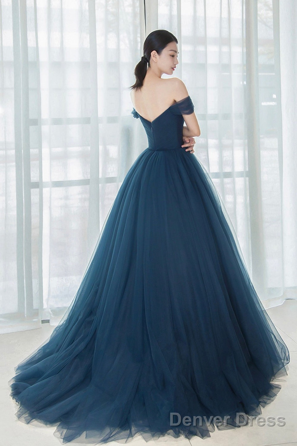 Elegant Tulle Long A-Line Prom Dress, Blue Off The Shoulder Evening Dress