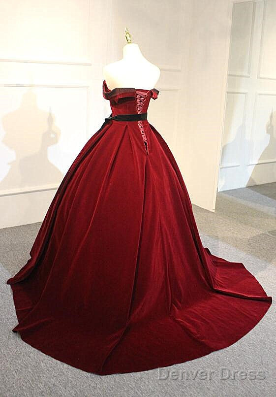 Elegant Wine Red Velvet Sweet 16 Gown With Belt, Off Shoulder Party Gown