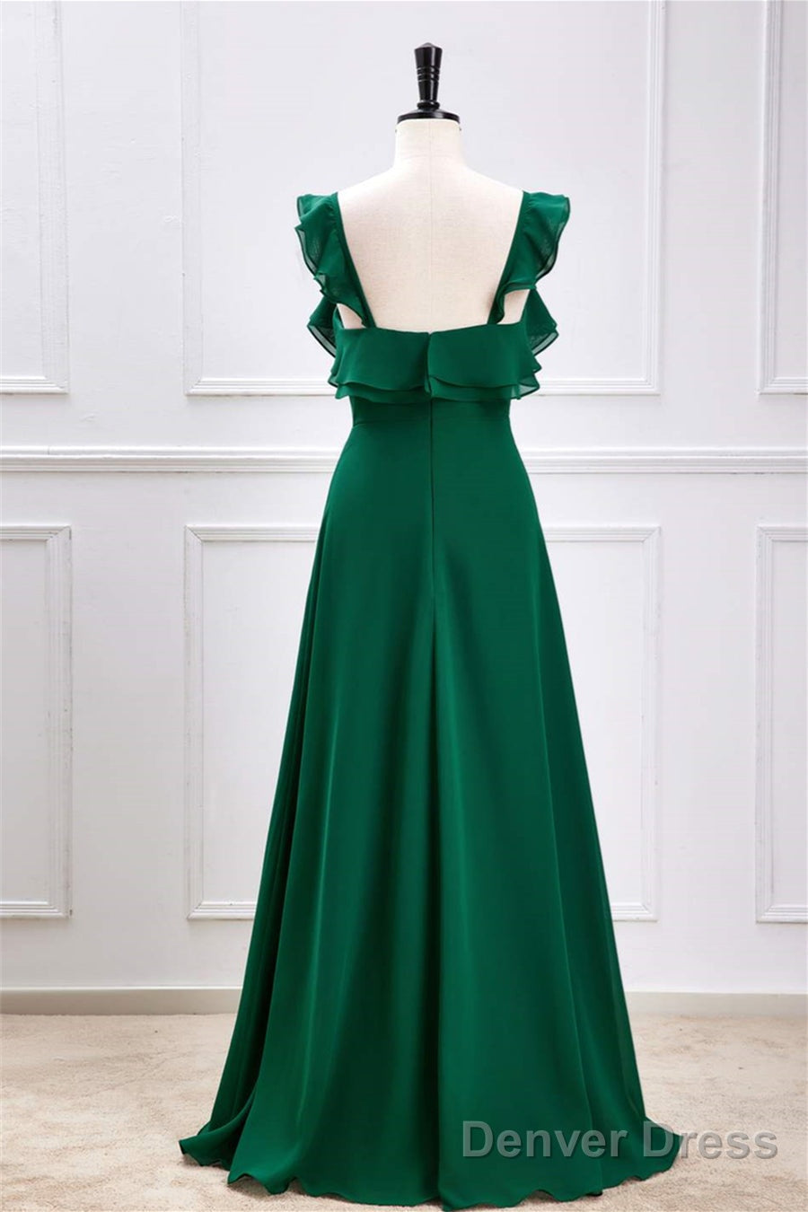 Emerald Green Ruffled Straps A-Line Bridesmaid Dress With Slit