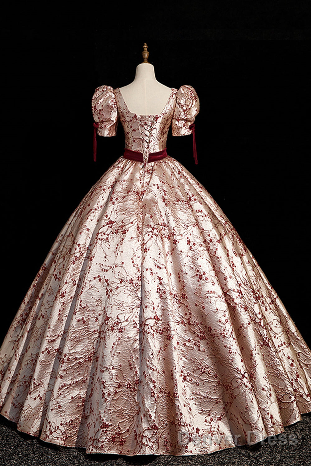 Fashion Floor-Length Printing Prom Dresses, Square Neckline Short Sleeve Backless Bow Sash Prom Formal Dresses