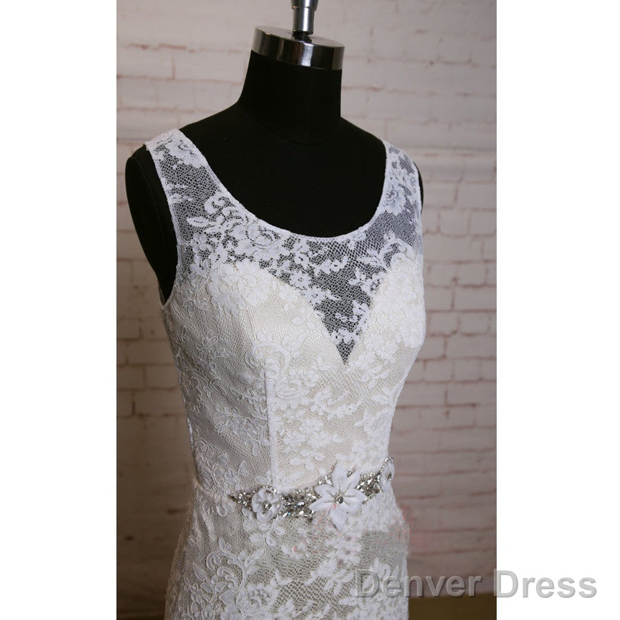Fashion Ivory Lace Elegant Scoop Neck Open Back Vintage Column Sweep Trailing Wedding Dresses,